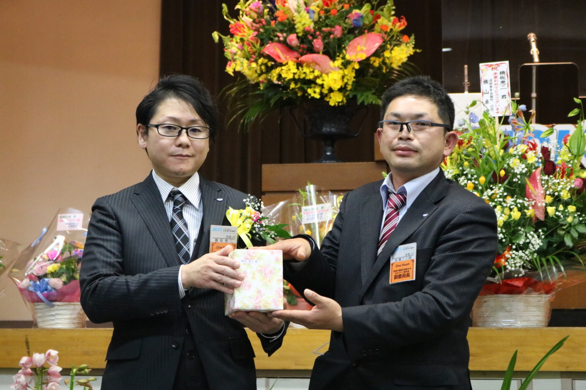 原澤直前理事長から千吉良理事長へ直前理事長バッジの交換が行われました。