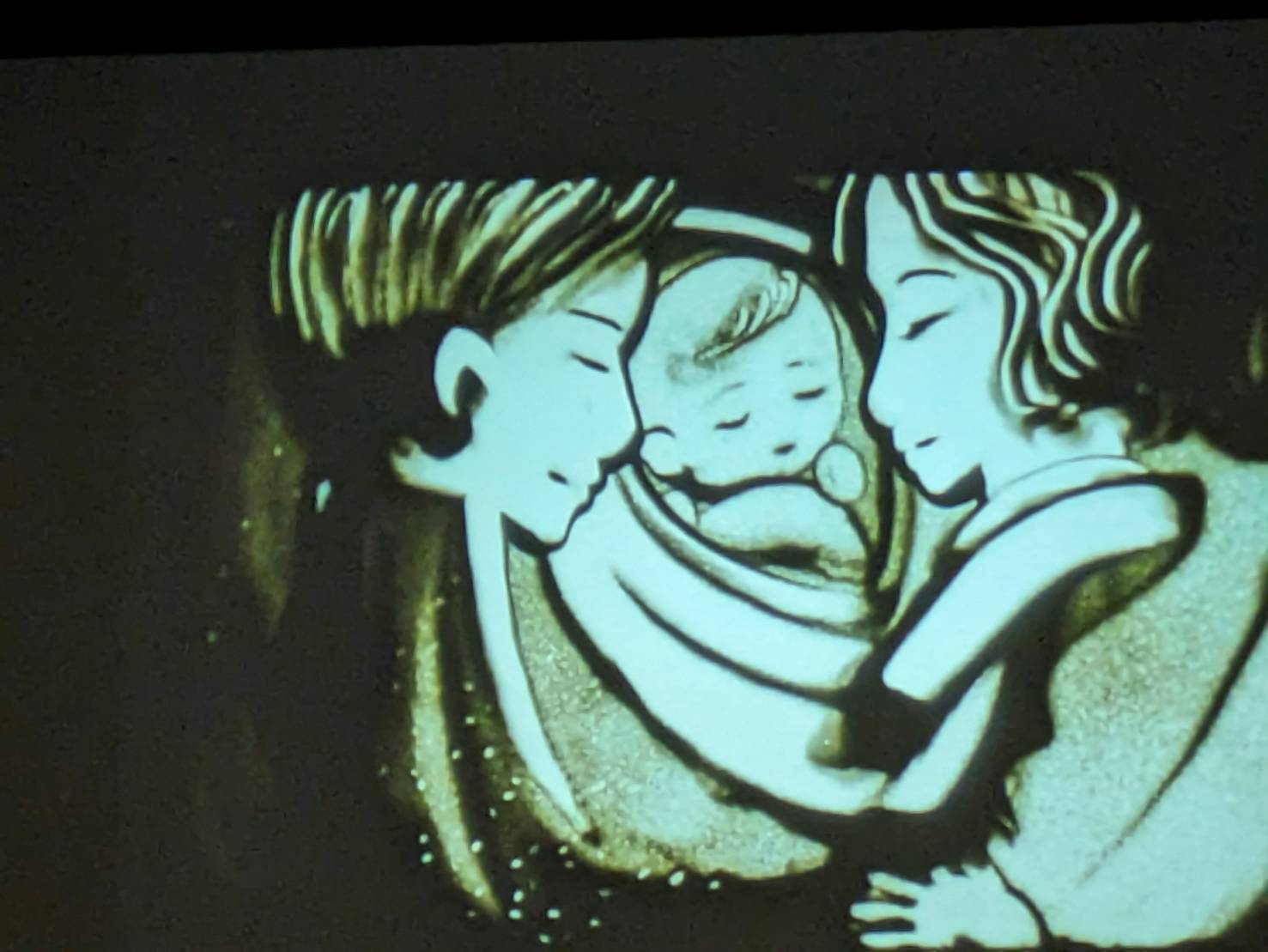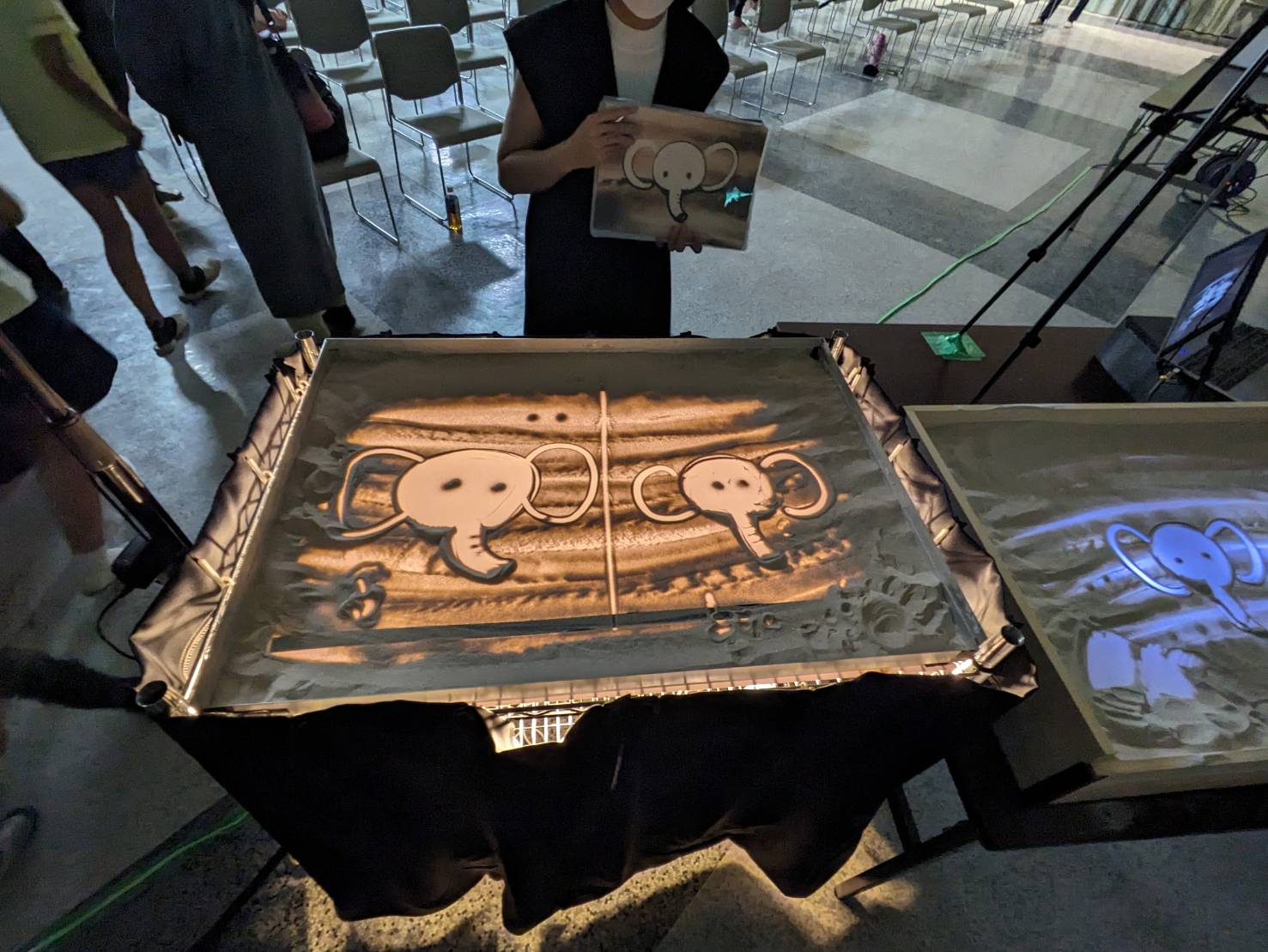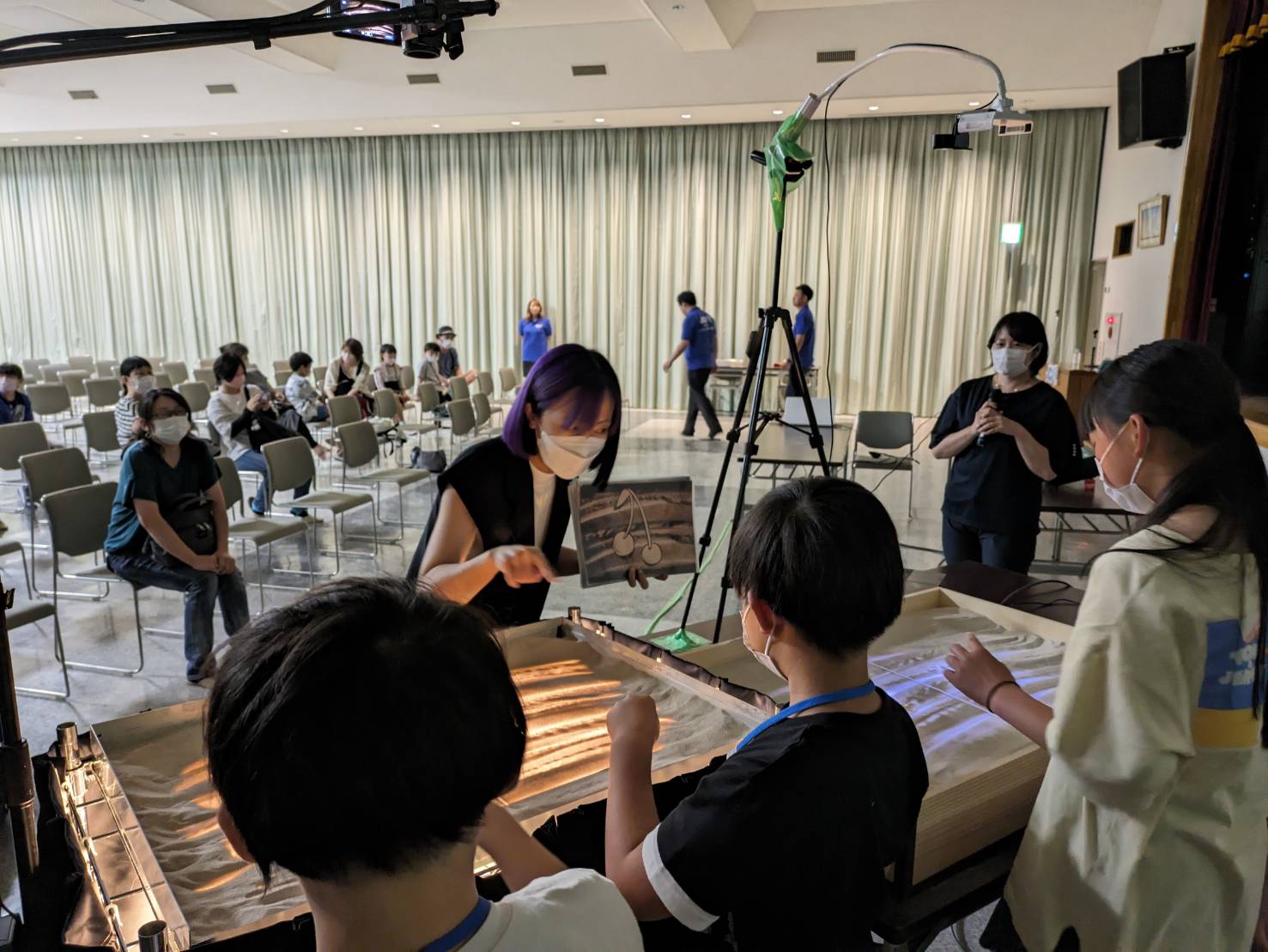 「命」というオリジナルストーリーの作品のパフォーマンスをしていただいた後、実際に子ども達がサンドアートを体験し絵当てクイズを行いました。
